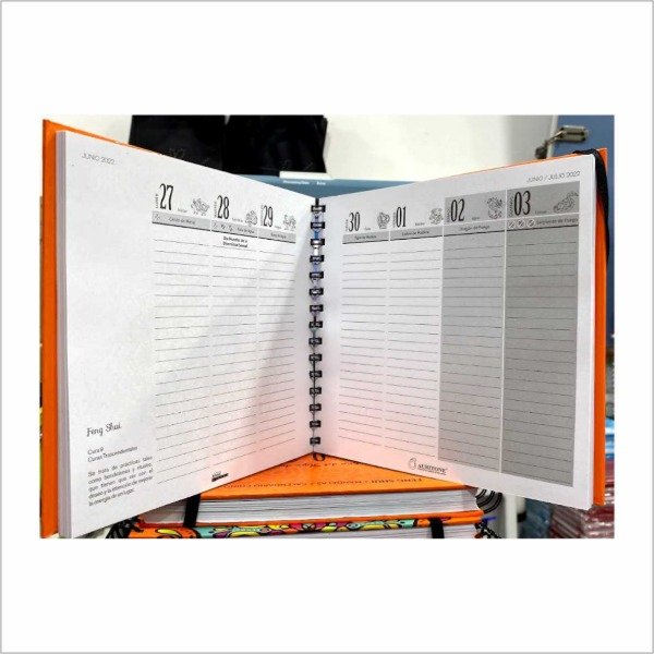 Tapa dura, laminada, laca sectorizada, elástico y doble anillo de alambre.